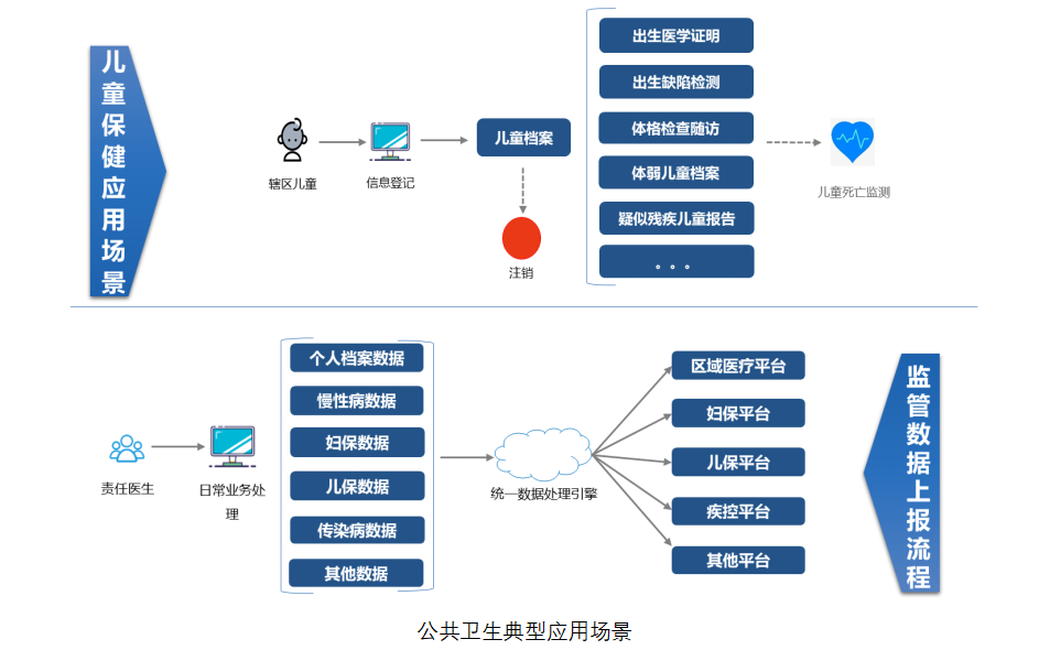 公共衛(wèi)生平臺(tái)具備健康檔案、健康教育、疾病管理、兒童保健、婦女保健、疾病控制和檔案遷移等功能,與第三方應(yīng)用(如:區(qū)域醫(yī)療集成平臺(tái)、婦保平臺(tái)、兒保平臺(tái)和疾控平臺(tái)等)進(jìn)行對(duì)接,通過統(tǒng)一報(bào)表的形式對(duì)慢病、健康檔案和老年人健康管理等進(jìn)行管理。