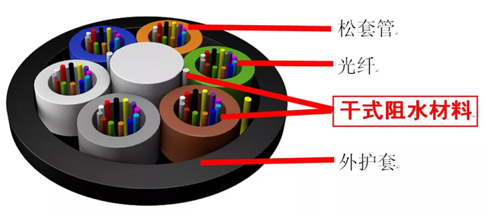 通常適合室外應(yīng)用的全干式光纜類型可以采用骨架式或?qū)咏g式結(jié)構(gòu),環(huán)境適應(yīng)能力強(qiáng)、應(yīng)用方便、可以做到大芯數(shù)。全干式層絞式結(jié)構(gòu)(Total Dry Stranding Optical Cable)典型的特征是采用阻水紗、阻水粉、阻水帶等干式材料取代傳統(tǒng)的纖膏、纜膏,實(shí)現(xiàn)全截面無液態(tài)物質(zhì),但又能滿足阻水標(biāo)準(zhǔn)要求。