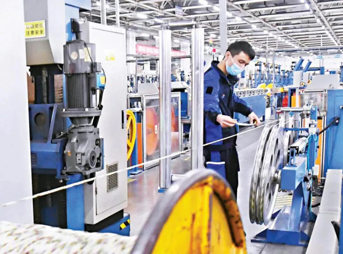 上午9時(shí)許,記者來到室外的光纜生產(chǎn)車間,技術(shù)人員在設(shè)備上輸入運(yùn)行指令,設(shè)定好參數(shù),設(shè)備就會自動(dòng)運(yùn)轉(zhuǎn),完成指定動(dòng)作。10余條自動(dòng)化生產(chǎn)線開足馬力,250微米左右粗細(xì)的光纖在一組設(shè)備間穿插而過,完成松套、絞合、護(hù)套等多個(gè)步驟。