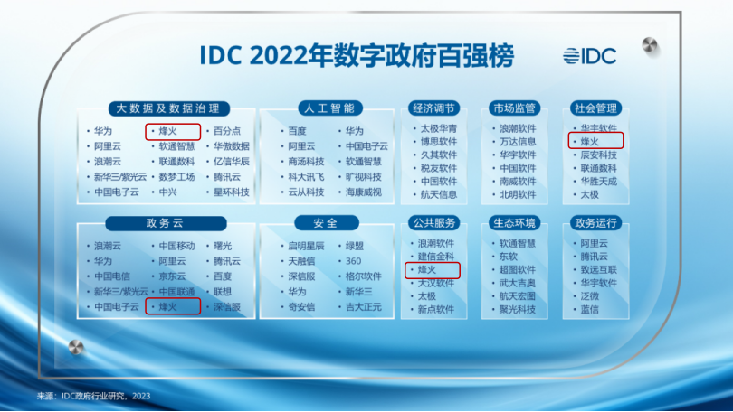 近日,國際權(quán)威咨詢機構(gòu)IDC發(fā)布《2022年數(shù)字政府百強榜》,該榜單根據(jù)2022年IDC政府行業(yè)組在數(shù)字政府領(lǐng)域的研究,評估了技術(shù)提供商的市場能力及市場份額,涵蓋十個技術(shù)領(lǐng)域模塊。其中,烽火進入大數(shù)據(jù)及數(shù)據(jù)治理、政務(wù)云、社會管理、公共服務(wù)四大模塊榜單。