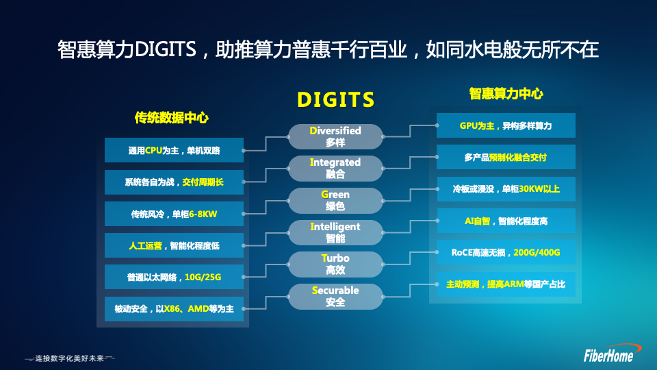 隨著算力需求不斷攀升,傳統(tǒng)數(shù)據(jù)中心面臨著六大挑戰(zhàn),包括異構計算需求多、建設周期長、資源消耗大、運維成本高、數(shù)據(jù)中心網(wǎng)絡難以滿足業(yè)務發(fā)展、安全挑戰(zhàn)大等問題。烽火通信智惠算力DIGITS(多樣、融合、綠色、智能、高效,安全)解決方案,可有效應對上述挑戰(zhàn),助推算力普惠千行百業(yè),如同水電般無所不在。