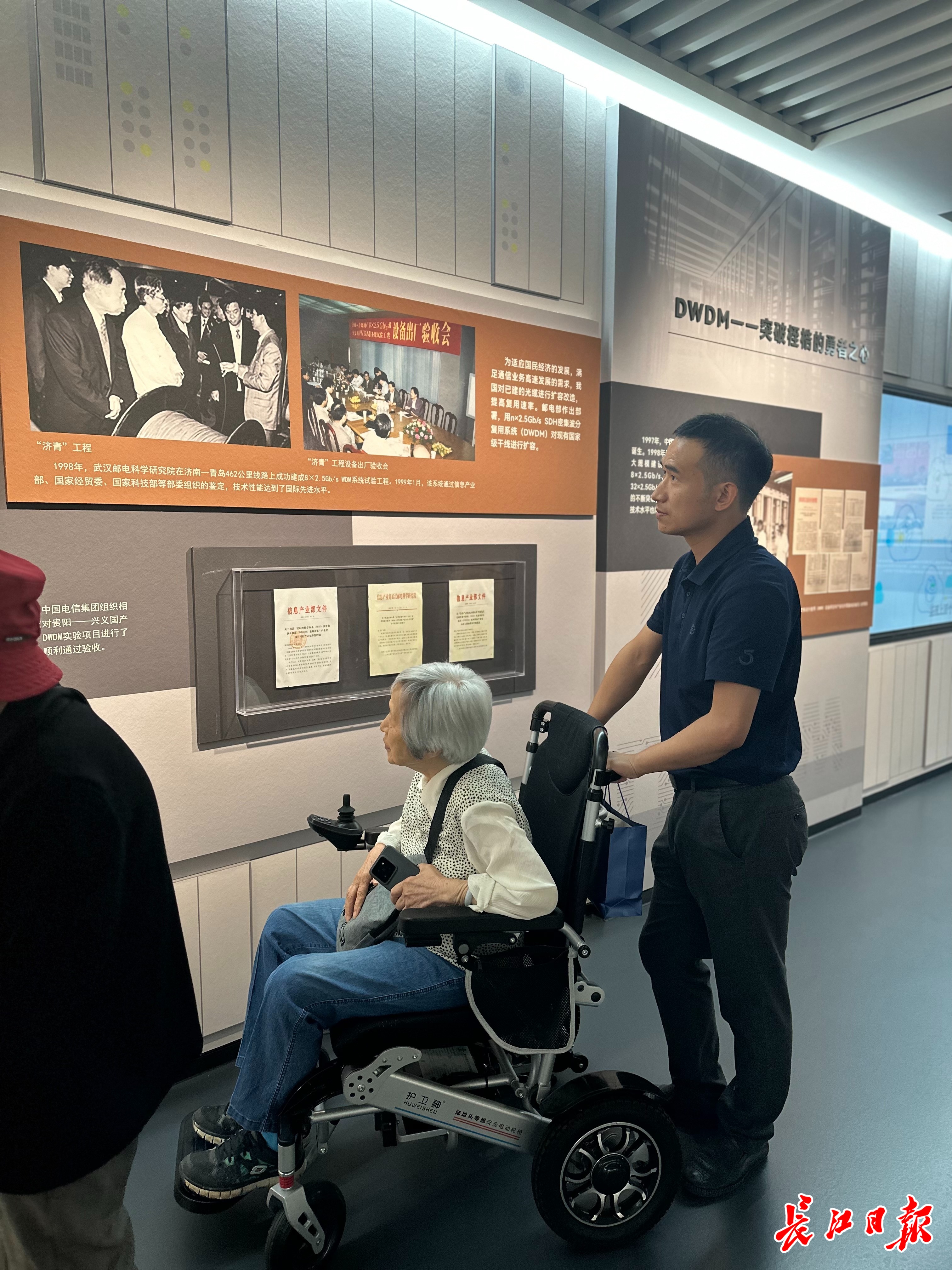 在“濟(jì)青工程”展區(qū),中國光纖之父趙梓森院士的夫人范幼英在展板前久久停駐。凝望著照片中那個(gè)熟悉的身影,片刻后,她緩緩說道:“他是工作狂。”讓身邊人無不動容。