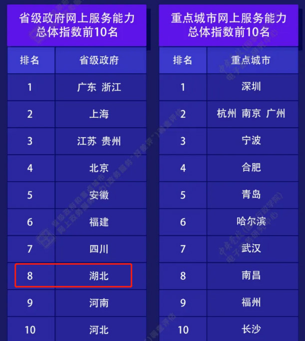 近日, 國(guó)務(wù)院辦公廳電子政務(wù)辦公室委托中央黨校(國(guó)家行政學(xué)院)電子政務(wù)研究中心編制的《省級(jí)政府和重點(diǎn)城市網(wǎng)上政務(wù)服務(wù)能力調(diào)查評(píng)估報(bào)告(2020)》(下簡(jiǎn)稱《報(bào)告》)正式發(fā)布,在省級(jí)政府網(wǎng)上政務(wù)服務(wù)能力總體指數(shù)評(píng)估中,湖北位列第8,較去年排名(全國(guó)第17位)躍升9位,成功進(jìn)入全國(guó)第一方陣。