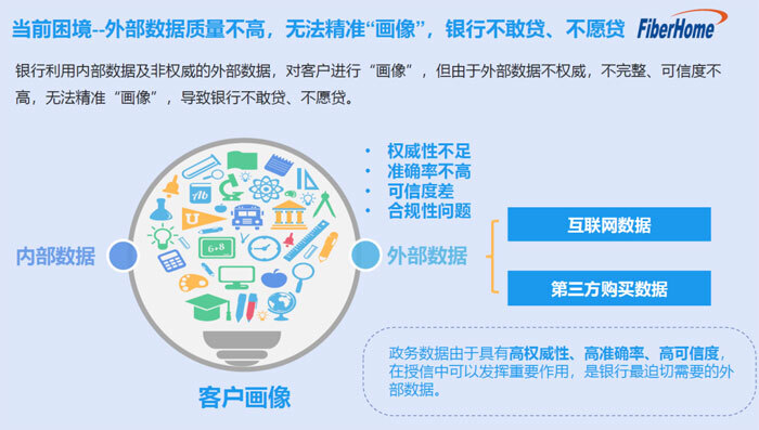 銀行發(fā)放一筆貸款,通常有貸前、貸中、貸后三個環(huán)節(jié)。以前,客戶經(jīng)理要上門對企業(yè)進(jìn)行盡職調(diào)查,需耗費大量時間精力了解企業(yè)經(jīng)營、財務(wù)等信息。近些年,在大數(shù)據(jù)等技術(shù)的助攻下,銀行信貸技術(shù)得以優(yōu)化,通過采集企業(yè)財務(wù)、征信等數(shù)據(jù),對企業(yè)進(jìn)行“畫像”,評估信用風(fēng)險,大大提高了信貸效率。但在普惠金融業(yè)務(wù)推進(jìn)中,銀行面臨的共同困難之一就是數(shù)據(jù)維度不夠豐富,特別是與企業(yè)相關(guān)的政務(wù)數(shù)據(jù)欠缺,難以對企業(yè)精準(zhǔn)“畫像”,很多中小微企業(yè)由于數(shù)據(jù)不足,被擋在了銀行大門外。