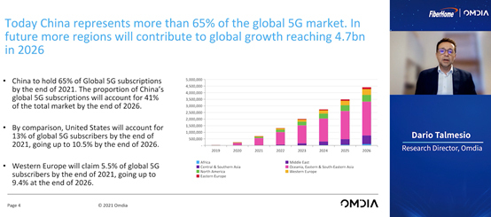 當(dāng)前全球5G建設(shè)正在蓬勃發(fā)展,眾多電信運(yùn)營商均已經(jīng)宣布或即將宣布5G商用。本次5G合作論壇上,Omdia分析師、研究主任 Dario Talmesio先生以《5G全球進(jìn)展和趨勢》為主題進(jìn)行了分享,他指出,“根據(jù)調(diào)查,5G用戶規(guī)模在2021年底將超過7億,其中中國市場占比超過65%。與此同時(shí),全球其他地區(qū)消費(fèi)者對5G應(yīng)用需求也持續(xù)增長,預(yù)計(jì)到2026年,全球5G用戶可達(dá)47億?;谝陨闲枨?,5G對于運(yùn)營商而言具有巨大潛力”。