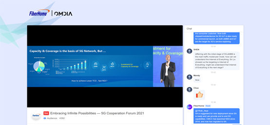 在嘉賓演講的同時(shí),來自全球50多個(gè)國家和地區(qū)的觀眾也在線上進(jìn)行了討論和互通。FiberHome的技術(shù)專家們不僅為論壇觀眾答疑解惑,還就5G產(chǎn)業(yè)發(fā)展,F(xiàn)iberHome整體戰(zhàn)略、解決方案等與全球伙伴展開了深入交流。
