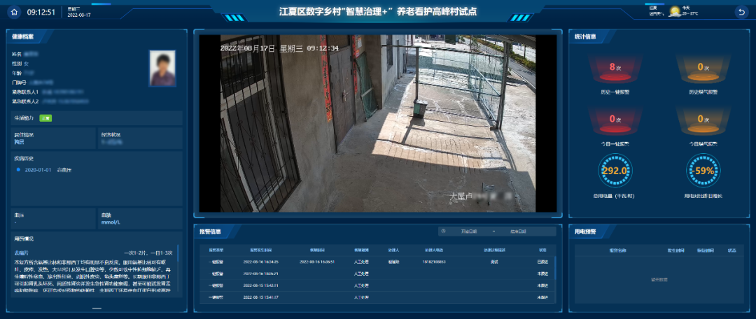 以南部山坡街道為主體,構(gòu)建“智慧治理+”平臺(tái)模式,對高峰村進(jìn)行“一環(huán)多點(diǎn)”治安防控體系的建設(shè),通過精確算法,將人口聚集、自然災(zāi)害、溺水、垃圾堆放、外來車輛等情況進(jìn)行及時(shí)預(yù)警和推送。為留守獨(dú)居老人安裝燃?xì)庑孤﹫?bào)警、電力脈象儀、一鍵 SOS 求助報(bào)警和可視化對講設(shè)備,各類數(shù)據(jù)統(tǒng)一接入高峰村治安中心,實(shí)現(xiàn) 24 小時(shí)實(shí)時(shí)監(jiān)測及預(yù)警。
