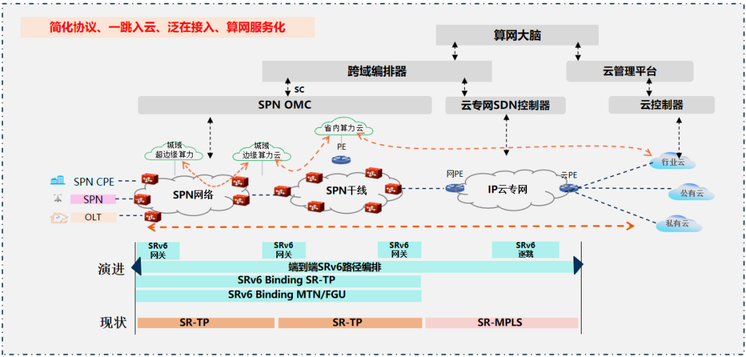 隨著國(guó)家大力發(fā)展數(shù)字基礎(chǔ)設(shè)施,以及“東數(shù)西算”戰(zhàn)略工程的快速推進(jìn),算力資源和網(wǎng)絡(luò)資源深度融合,將物理分布的城域邊緣、區(qū)域中心、核心樞紐的算力資源進(jìn)行連接,動(dòng)態(tài)實(shí)時(shí)感知算力業(yè)務(wù)需求、算力資源狀態(tài)、算力路由等信息,進(jìn)而對(duì)算和網(wǎng)資源進(jìn)行合理的分配調(diào)度。目前,中國(guó)移動(dòng)已完成近40萬(wàn)端SPN設(shè)備部署,建成全球大規(guī)模的5G商用承載網(wǎng)絡(luò),具備連接云邊端泛在算力資源的顯著優(yōu)勢(shì)。SPN算網(wǎng)承載技術(shù)演進(jìn)主要有以下3個(gè)方面: