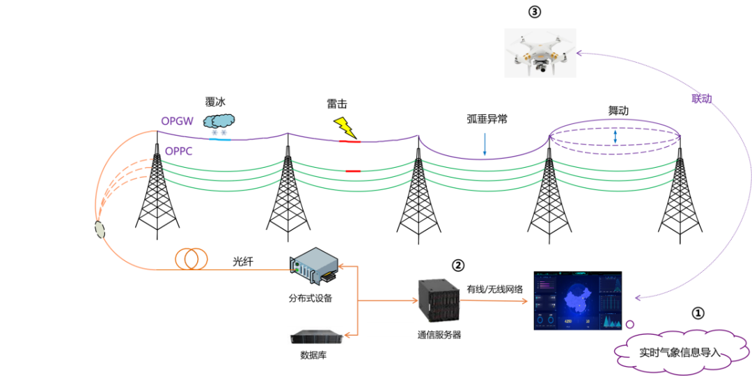 烽火分布式覆冰舞動監(jiān)測方案示意圖