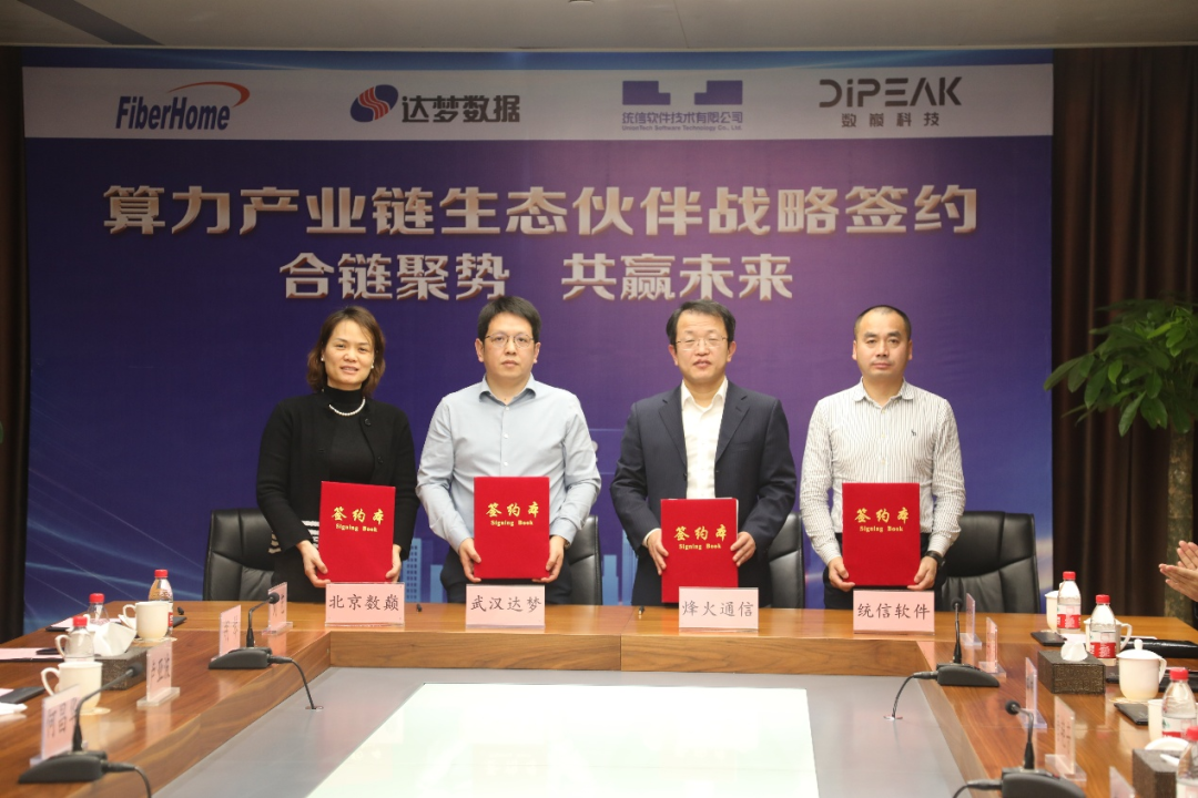 烽火通信、達(dá)夢數(shù)據(jù)、統(tǒng)信軟件和數(shù)巔科技的相關(guān)領(lǐng)導(dǎo)出席儀式,并代表各方共同簽訂戰(zhàn)略合作協(xié)議。