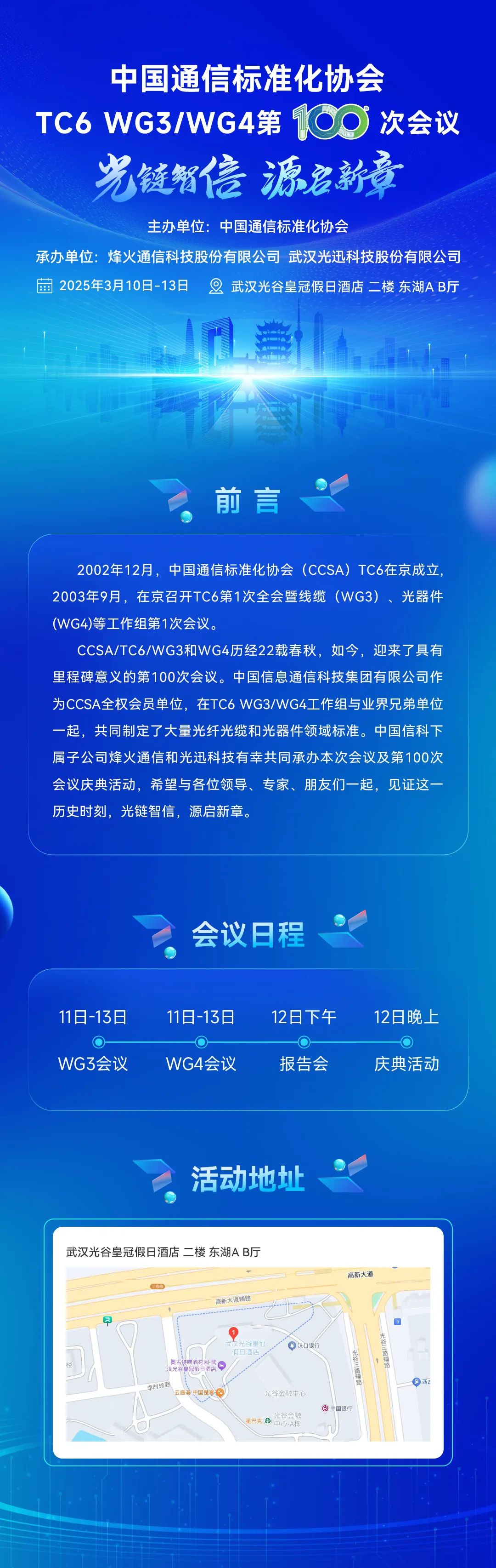 3月10日-3月13日,由中國通信標(biāo)準(zhǔn)化協(xié)會主辦,烽火通信和光迅科技承辦的TC6 WG3/WG4第100次工作會議將在武漢隆重召開。來自全國90余家科研機(jī)構(gòu)、企業(yè)的近300位專家學(xué)者將齊聚于此,共同展望通信標(biāo)準(zhǔn)化的廣闊前景,攜手書寫行業(yè)發(fā)展的創(chuàng)新篇章。