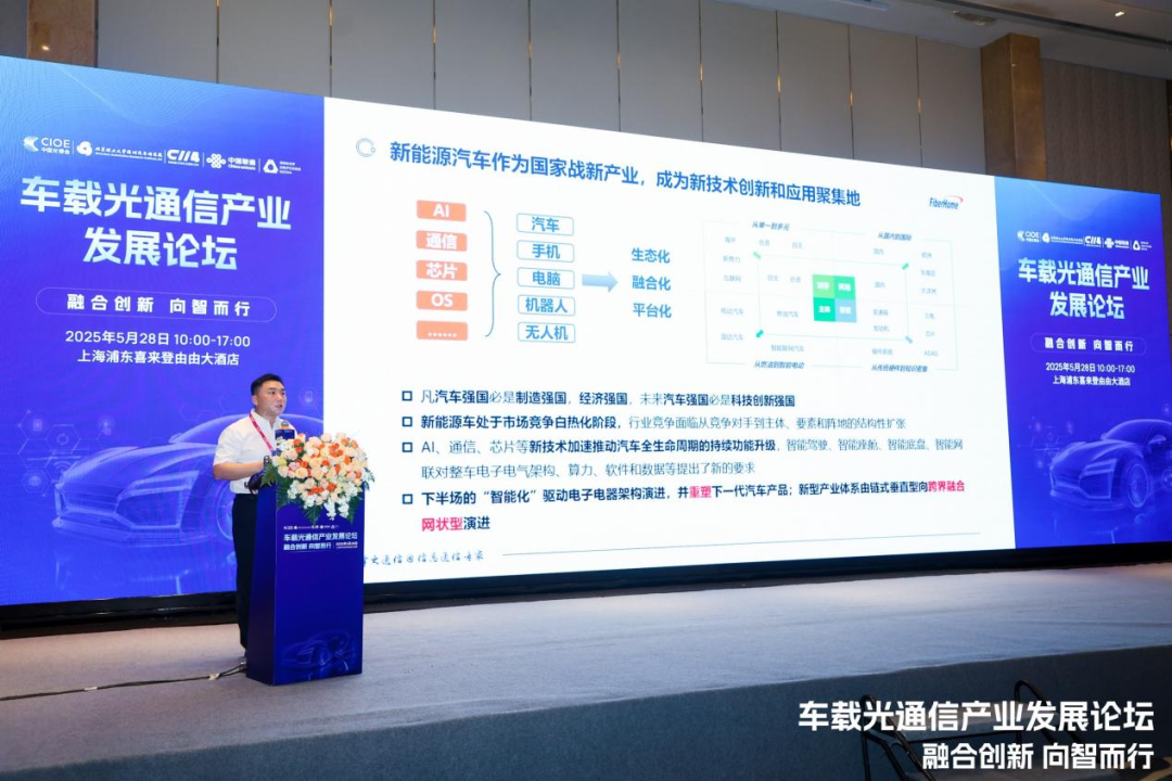 5月28日,“2025車(chē)載光通信產(chǎn)業(yè)發(fā)展論壇”在上海成功舉辦。此次論壇匯聚了車(chē)載光通信領(lǐng)域的眾多專(zhuān)家學(xué)者以及上下游全產(chǎn)業(yè)鏈廠商,共同圍繞車(chē)載光通信產(chǎn)業(yè)的標(biāo)準(zhǔn)體系、前沿技術(shù)、創(chuàng)新應(yīng)用與未來(lái)發(fā)展戰(zhàn)略展開(kāi)深入探討,致力于推動(dòng)汽車(chē)產(chǎn)業(yè)與光通信技術(shù)的深度融合,促進(jìn)產(chǎn)業(yè)生態(tài)的繁榮發(fā)展。烽火通信詹翊春在論壇上發(fā)表主題報(bào)告,從產(chǎn)業(yè)發(fā)展的底層邏輯和架構(gòu)思維出發(fā),分享了烽火通信在車(chē)載光通信領(lǐng)域的產(chǎn)業(yè)洞察與價(jià)值主張。
