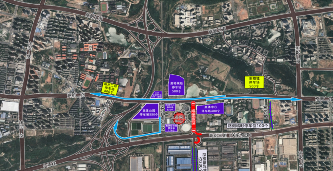 高新二路西向東車輛(奧體中心360停車場、高新二路南側(cè)臨時停車泊位、奧風(fēng)路臨時停車泊位),引導(dǎo)至光谷三路進(jìn)入高新大道駛?cè)肴h(huán)線或雄楚高架。