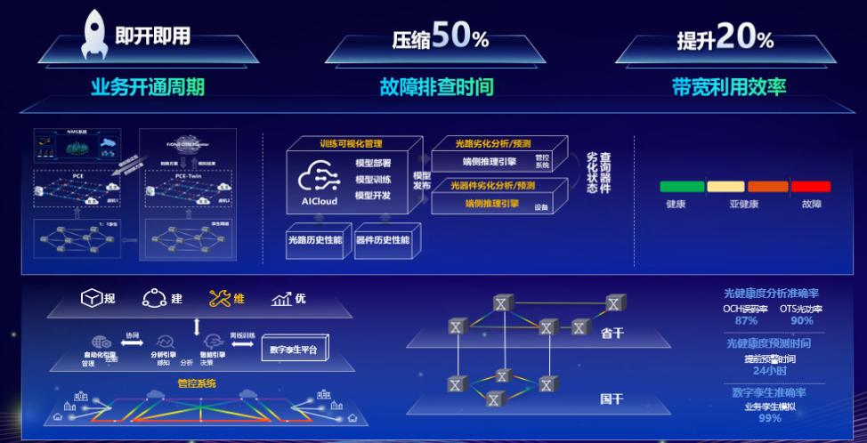 迭代優(yōu)化調(diào)度算法,精準(zhǔn)匹配400G業(yè)務(wù)大流量、高可靠的特性,構(gòu)建更高效的資源調(diào)度邏輯。定義開放北向API接口,打破數(shù)據(jù)孤島,實(shí)現(xiàn)400G業(yè)務(wù)端到端狀態(tài)的實(shí)時(shí)監(jiān)控與靈活調(diào)控。強(qiáng)化光層智能賦能,以數(shù)字孿生為核心,通過光層感知、預(yù)測(cè)能力構(gòu)建網(wǎng)絡(luò)全生命周期虛擬鏡像,提前識(shí)別400G信號(hào)衰減、鏈路干擾等潛在風(fēng)險(xiǎn),疊加ASON智能光層自動(dòng)重路由功能,推動(dòng)運(yùn)維模式從“被動(dòng)搶修”到“主動(dòng)預(yù)防”的轉(zhuǎn)變。
