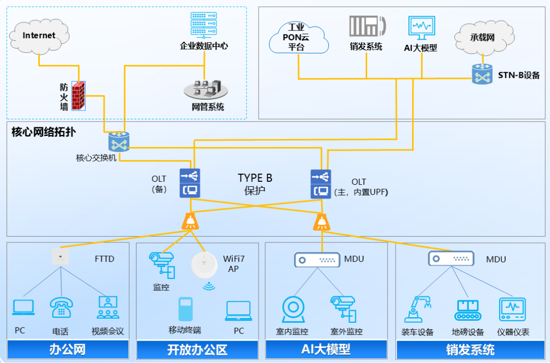 本次項(xiàng)目在工業(yè)場(chǎng)景中率先實(shí)現(xiàn)有線光網(wǎng)與無(wú)線網(wǎng)絡(luò)的深度融合。通過(guò)在企業(yè)核心機(jī)房部署集成輕量化UPF的50G PON OLT設(shè)備,創(chuàng)新打造“雙域快網(wǎng)”解決方案,為海螺水泥構(gòu)建輕量型雙5G專網(wǎng)及工業(yè)互聯(lián)網(wǎng)平臺(tái)基礎(chǔ)設(shè)施(MEC),實(shí)現(xiàn)內(nèi)外網(wǎng)一體化安全接入。