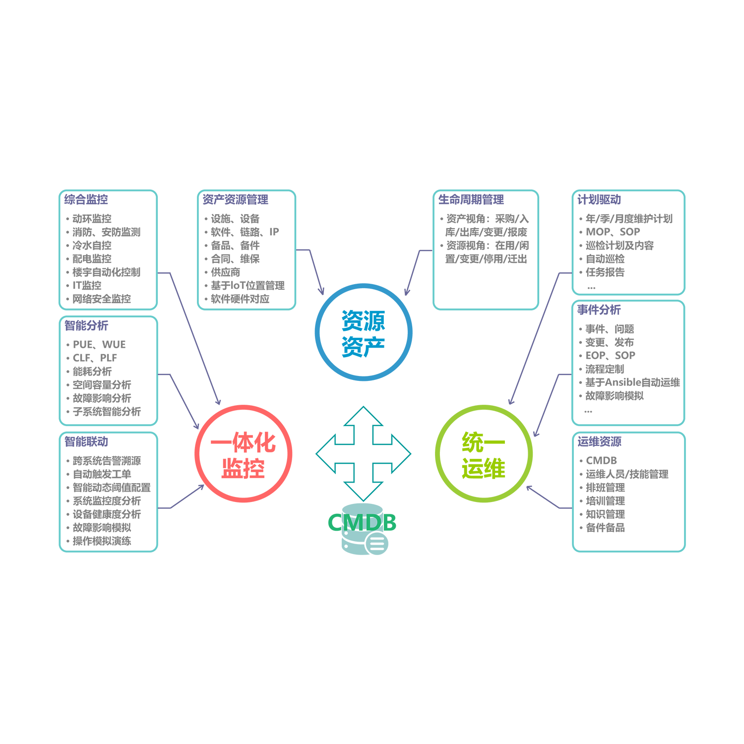 綜合監(jiān)控運(yùn)維管理系統(tǒng)以CMDB為核心,整合了數(shù)據(jù)中心的監(jiān)控管理、資源資產(chǎn)管理以及運(yùn)維管理等事務(wù),涵蓋了所有的運(yùn)維要素,通過數(shù)據(jù)掌控數(shù)據(jù)中心所有的流程和工具,對數(shù)據(jù)中心的計劃管理,事件管理,問題管理,變更管理,發(fā)布管理等功能提供完整的數(shù)據(jù)支撐,以達(dá)到協(xié)助用戶快速建立完整的、運(yùn)維業(yè)務(wù)為核心的綜合監(jiān)控運(yùn)維管理系統(tǒng),使用戶的運(yùn)維管理工作從日常的運(yùn)維監(jiān)控、統(tǒng)計分析、問題發(fā)現(xiàn)與管理、解決朝著向流程化轉(zhuǎn)型。